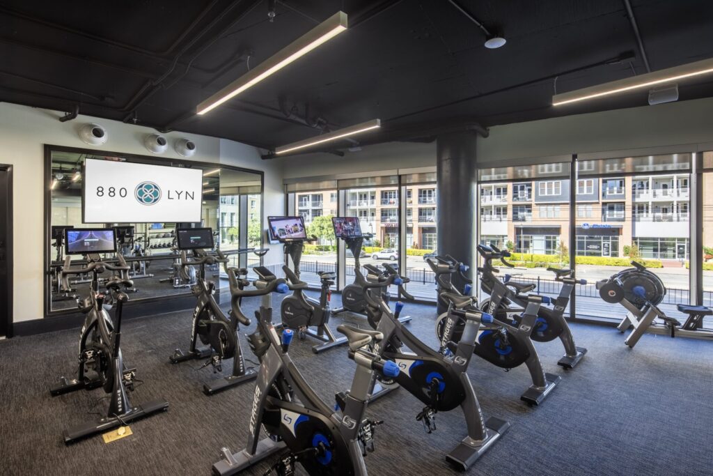 - 2-story fitness studio with weights, cardio equipment, & yoga/spin area